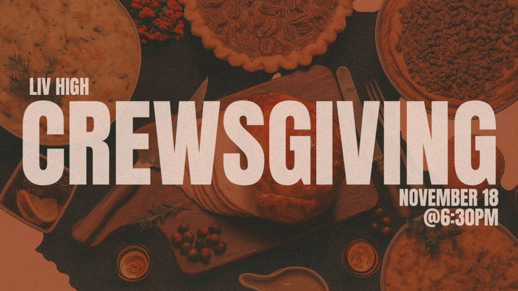 It’s CrewsGiving — a night to slow down, laugh a lot, and hang with your crew. We’ll have Human Bingo, treats from our crew leaders, and a time to reflect on all God’s done this year!